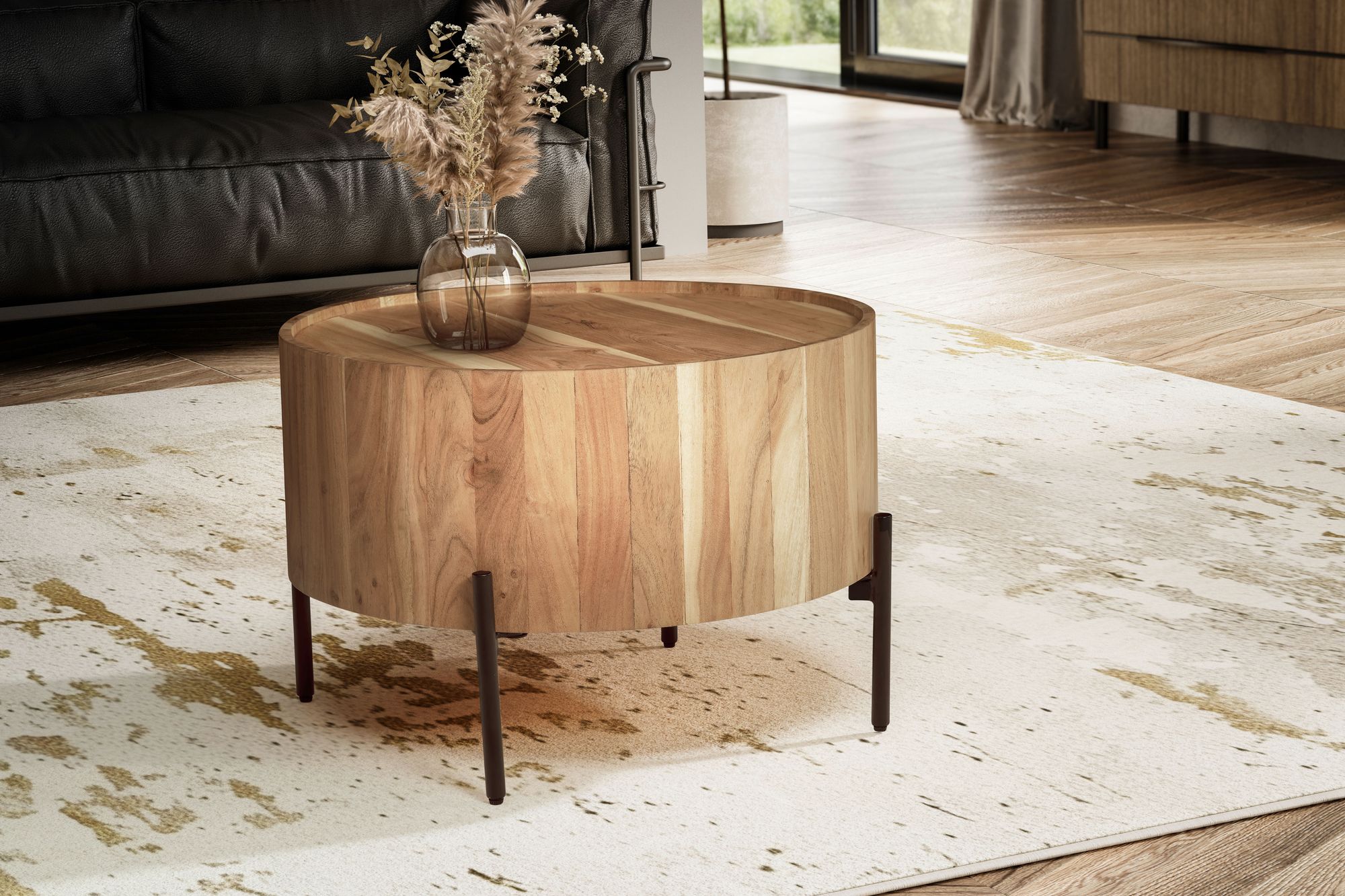 Adicione um toque natural e moderno à sua sala com esta mesa de centro redonda em madeira maciça de acácia e estrutura em metal preto. O design elegante combina durabilidade com leveza visual.
