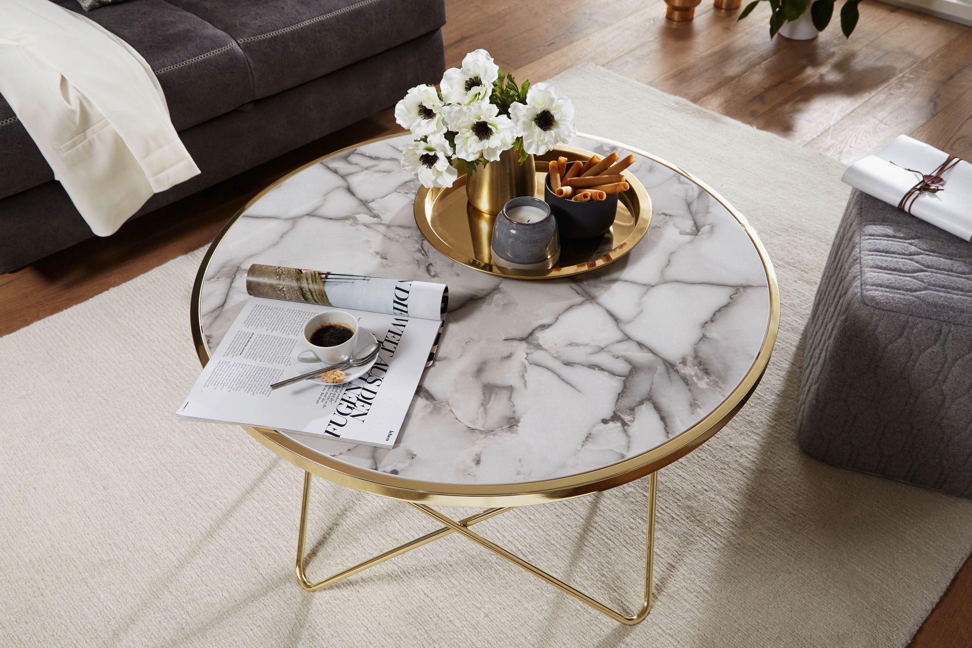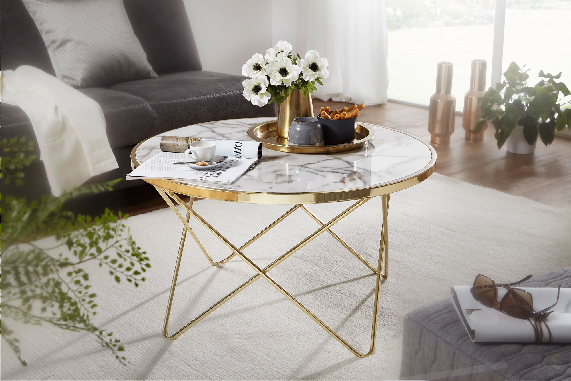 Mesa de centro design efeito mármore branco | Estrutura metálica dourada | Ø 85 cm