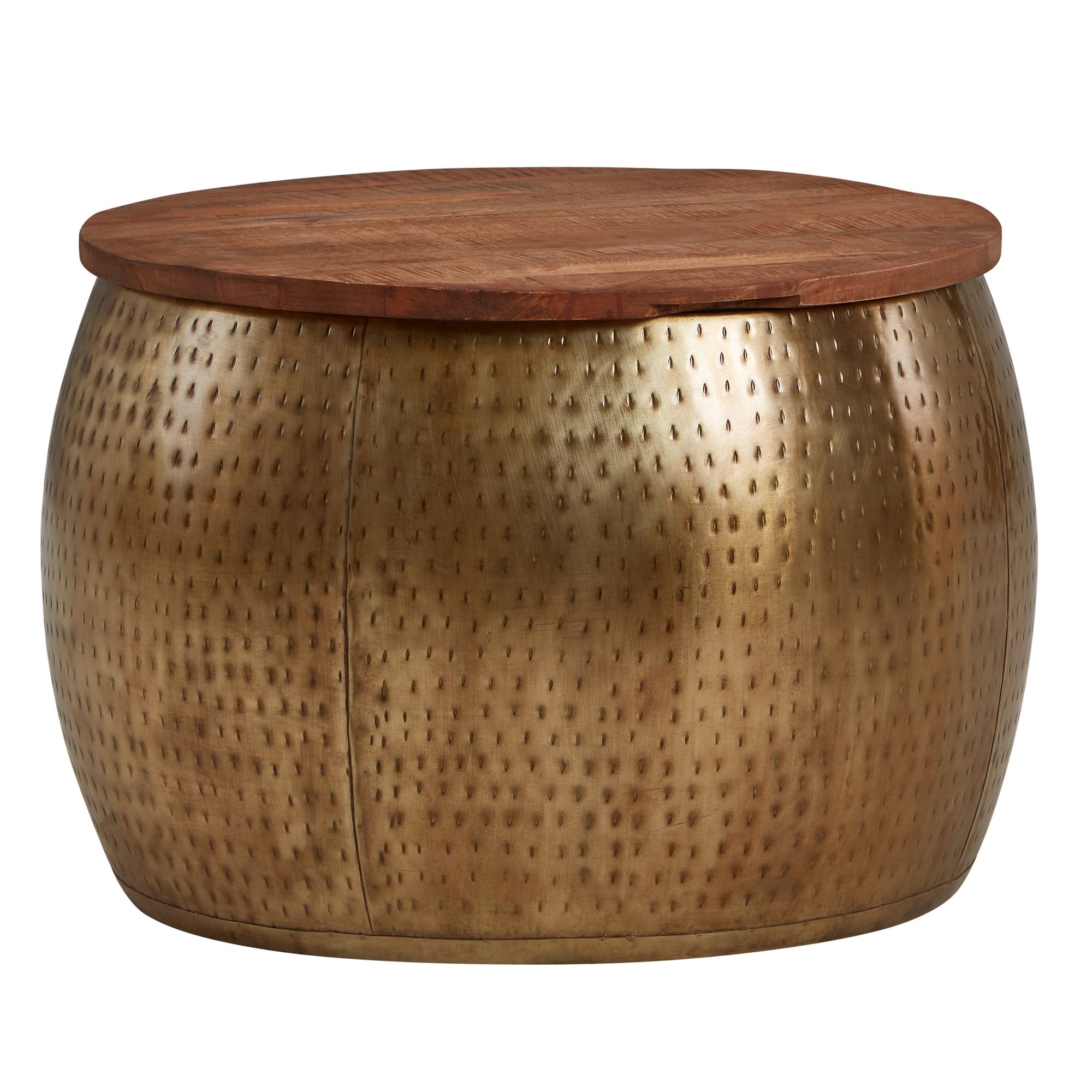 Adicione um toque de elegância com esta mesa de centro redonda em madeira maciça de manga reciclada combinada com estrutura metálica dourada. Cada peça é feita à mão e possui acabamento protetor com verniz transparente.