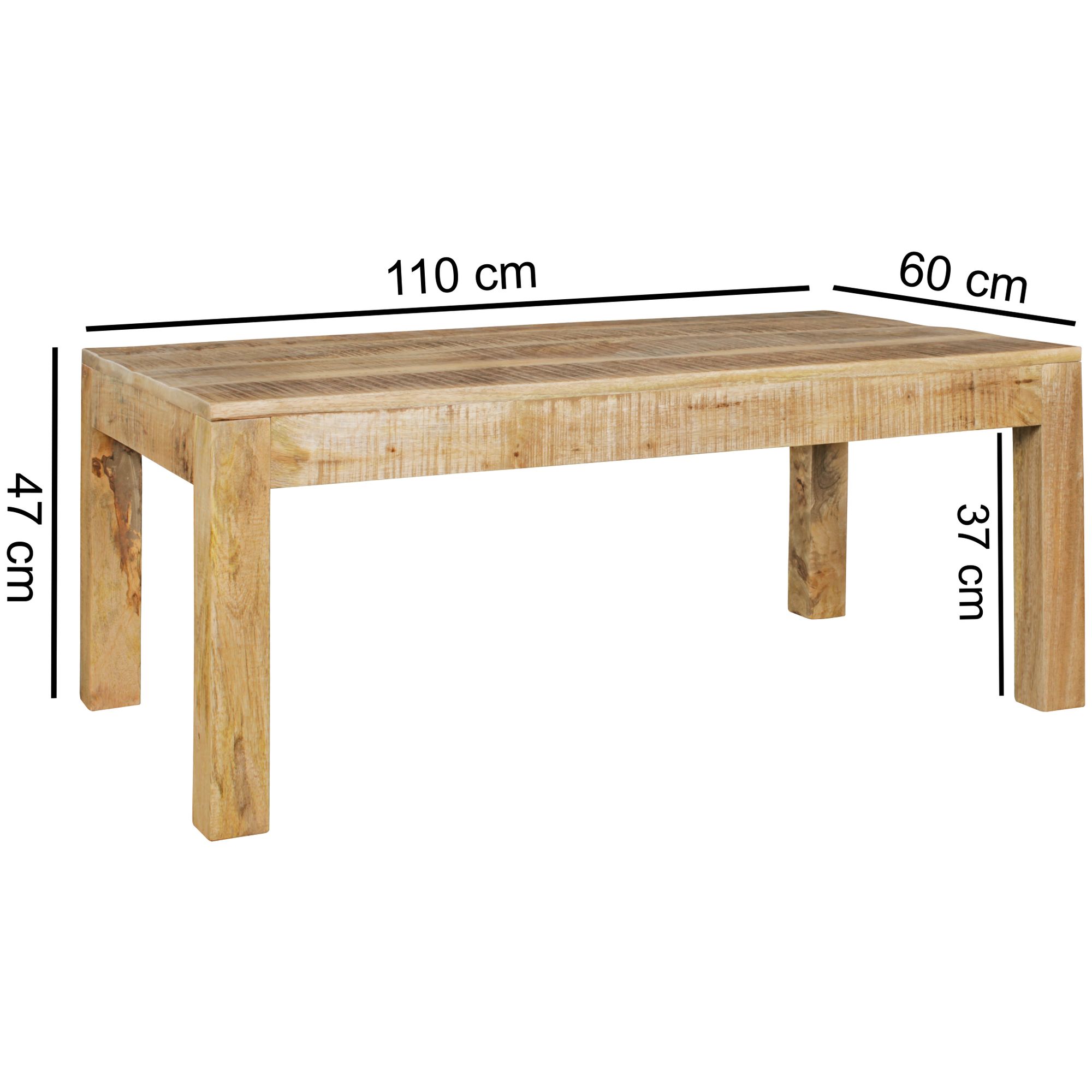 Informações de produto "Mesa de centro em madeira maciça de manga natural 110 x 47 x 60 cm | Estilo rústico | Dimensões retangulares"