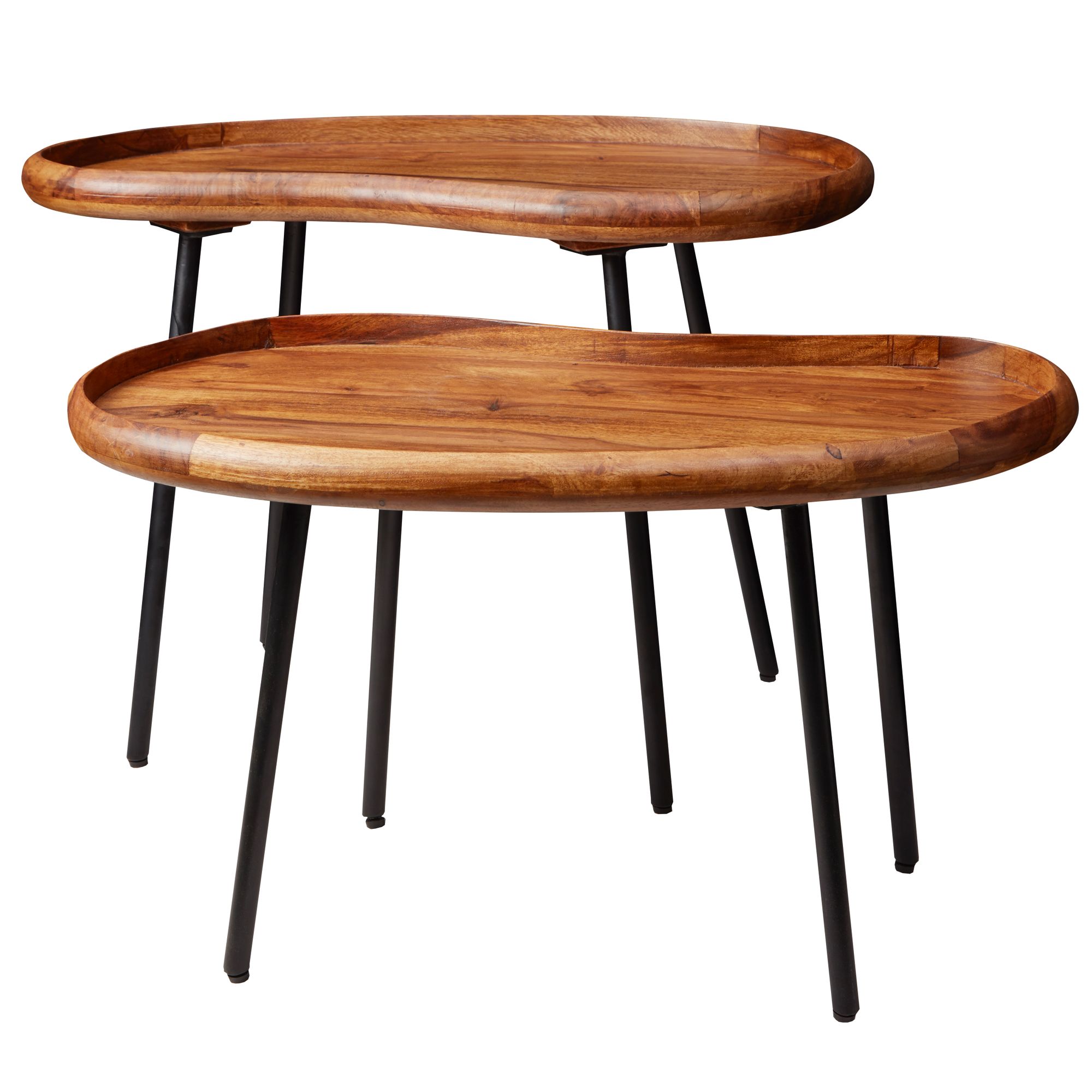 Adicione um toque retrô à sua sala com esta mesa de centro em madeira maciça Sheesham. A placa em forma de rim mede 71x42x40 cm e possui pés de metal preto para estabilidade duradoura.