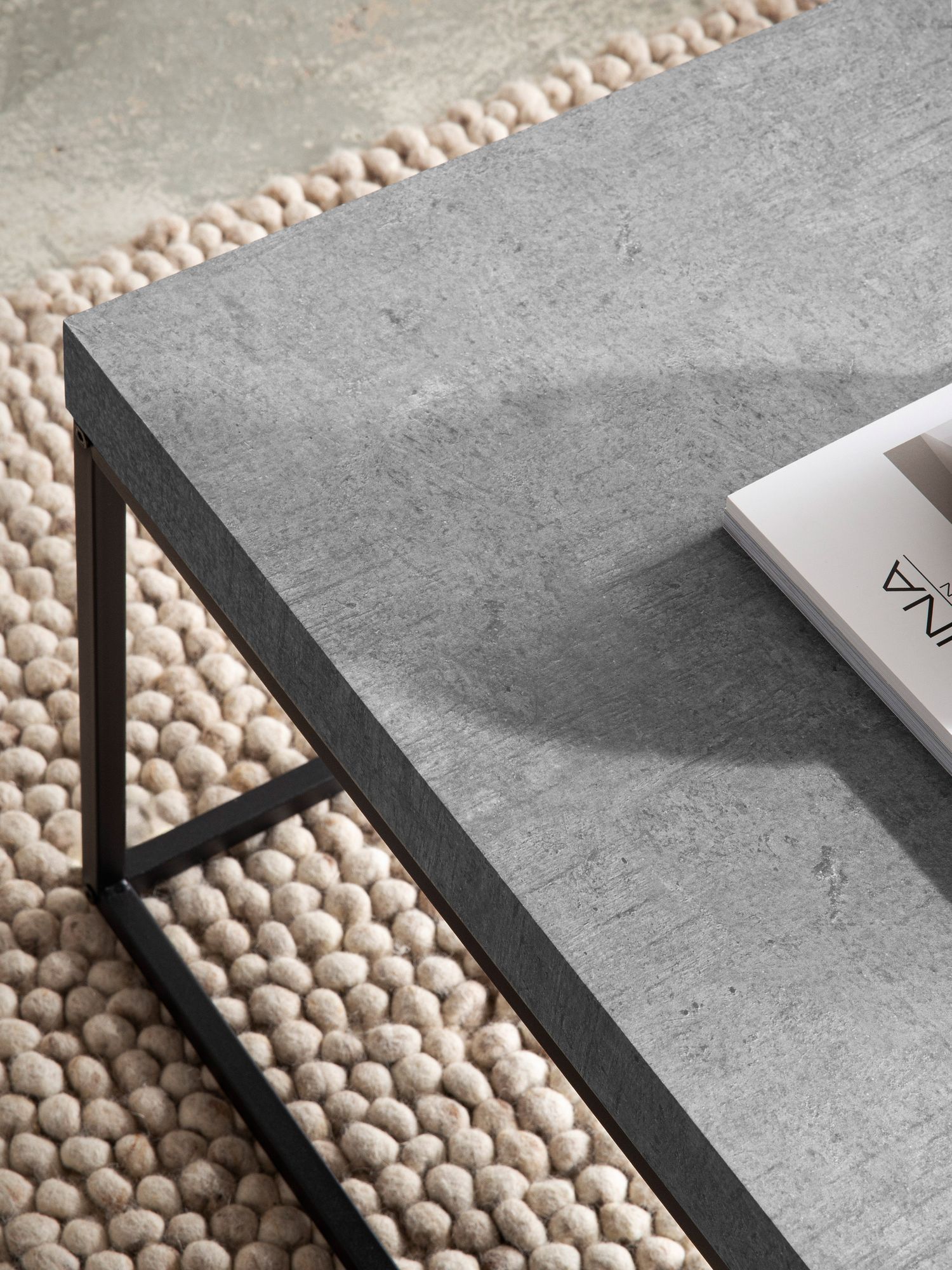 Mesa de centro minimalista com grande tampo laminado em MDF cinza com acabamento em cimento, ideal para apoiar ou exibir objetos. A estrutura metálica preta com pintura em pó garante resistência e suporte.