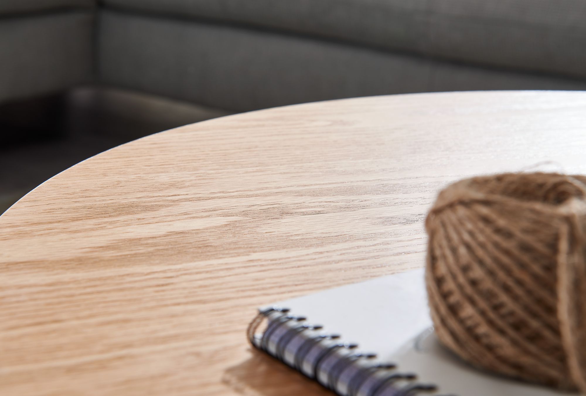 Descubra esta mesa de centro com design moderno e simples que combina a calor da madeira com a robustez do metal. O amplo tampo redondo em painel com folheado de carvalho natural revela uma textura distinta, realçada pela estrutura em aço preto mate.