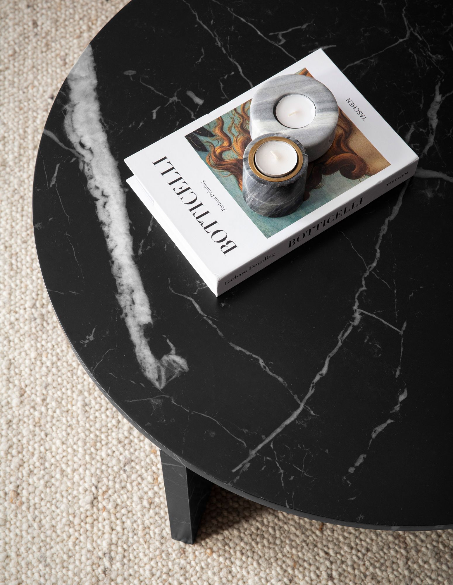Adicione um toque sofisticado ao seu interior com esta mesa de centro moderna com design em mármore preto fosco. A forma redonda maximiza o espaço para controles remotos, revistas e objetos decorativos. Feita de MDF laminado com revestimento de verniz transparente, combina estética e resistência.