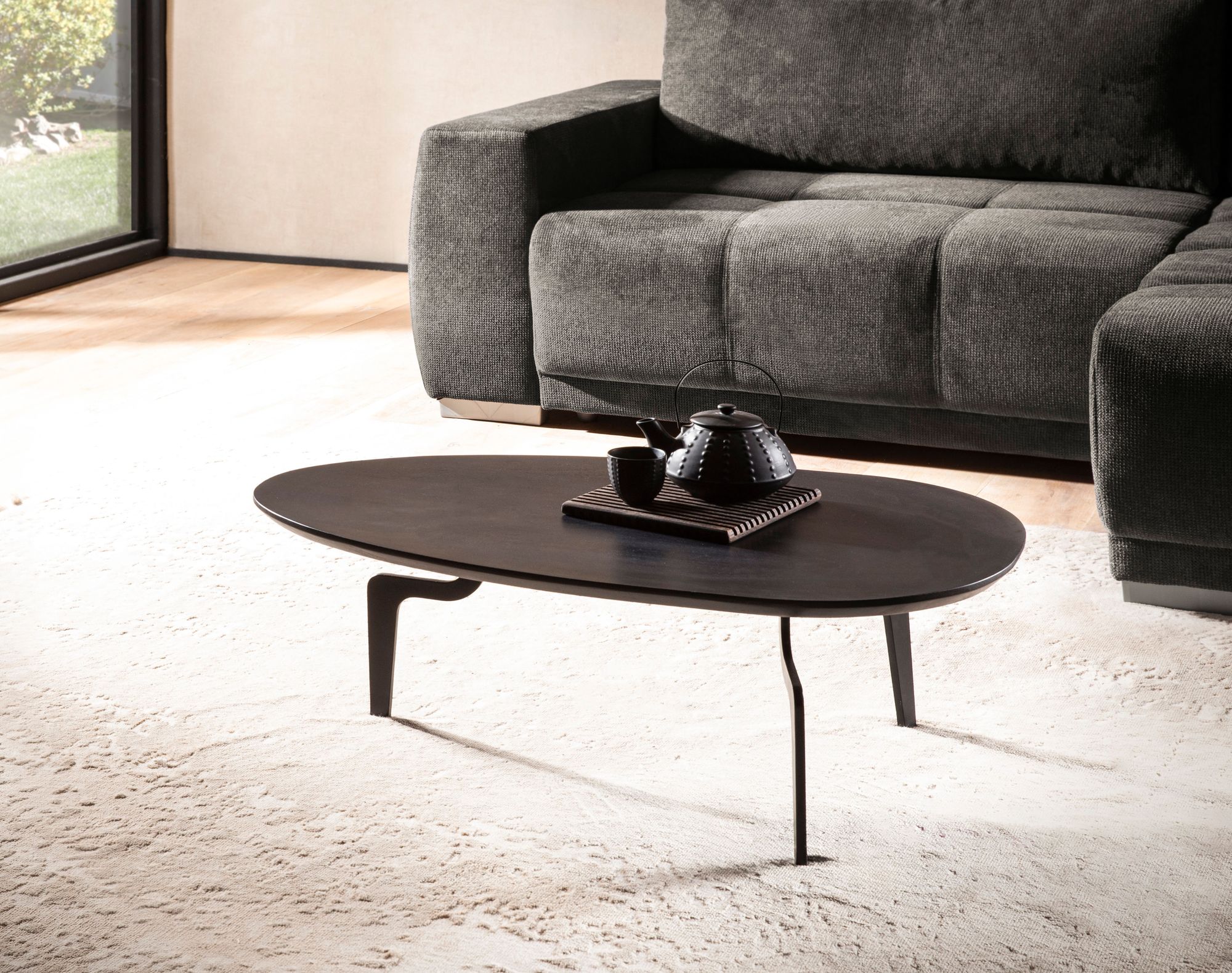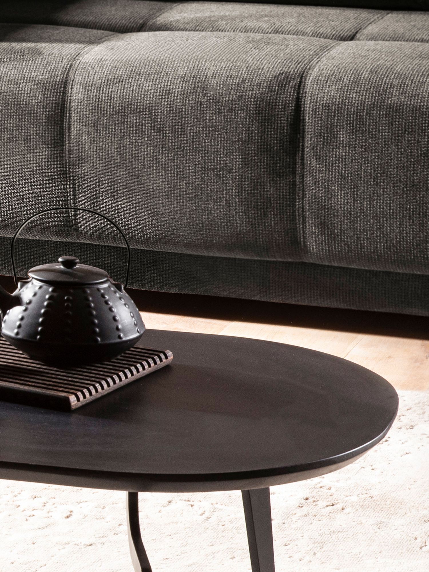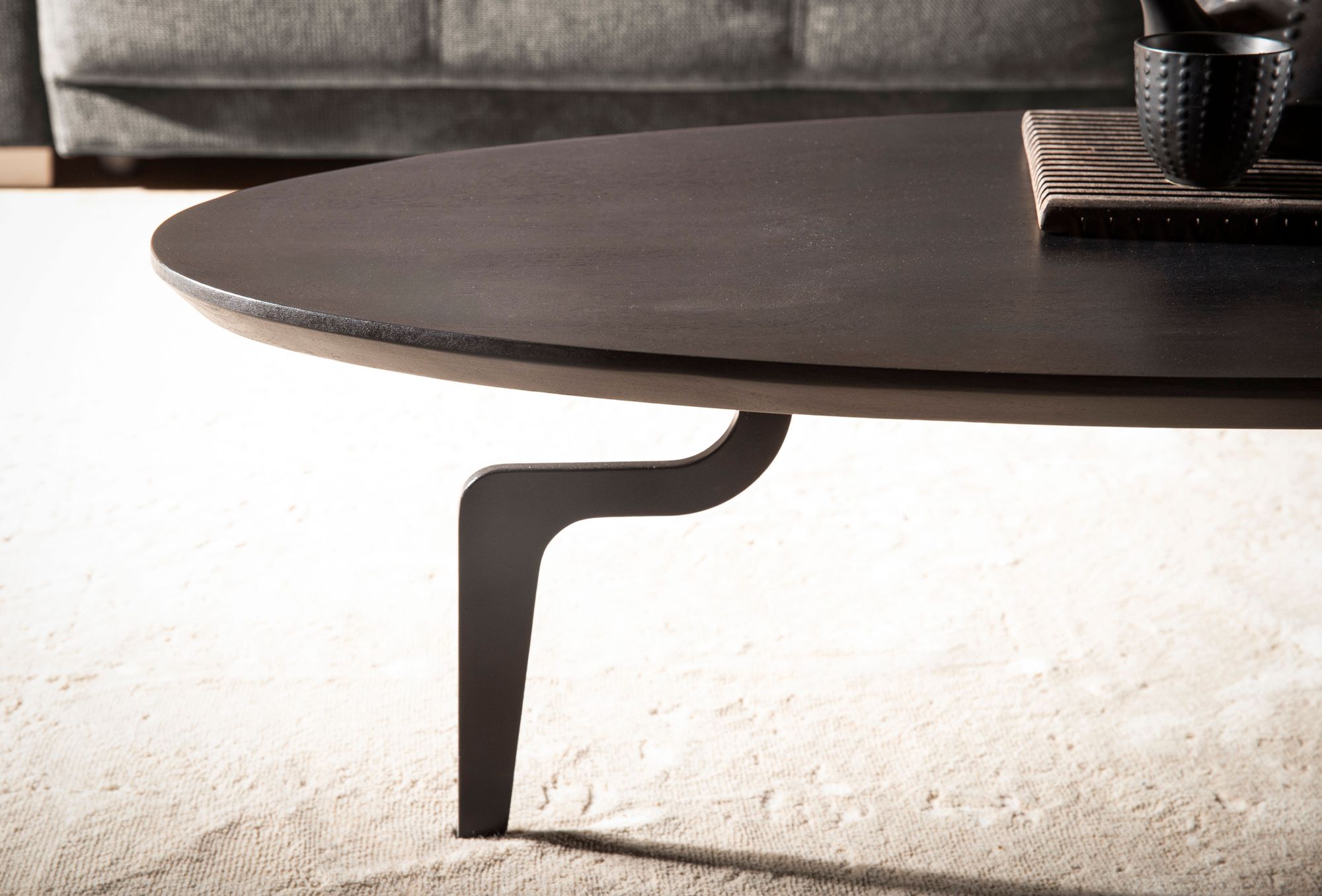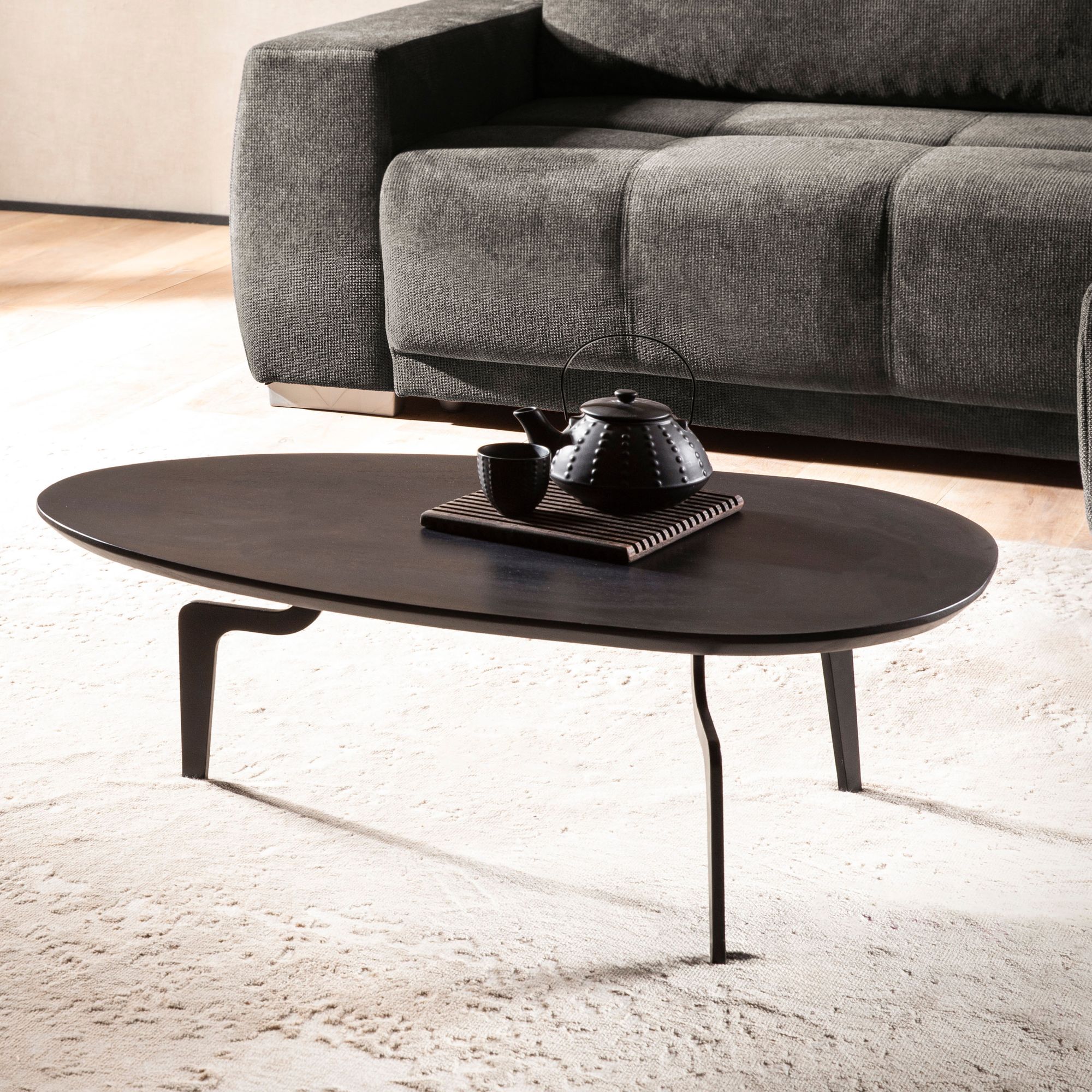 Esta mesa de centro oval em madeira maciça de manga preta combina elegância e funcionalidade. Sua base tripé em ferro pintado a pó suporta um tampo sólido com veios naturais visíveis, agregando calor e autenticidade à sala de estar.