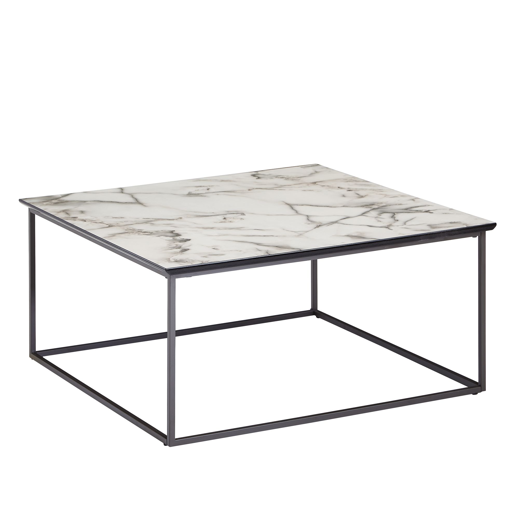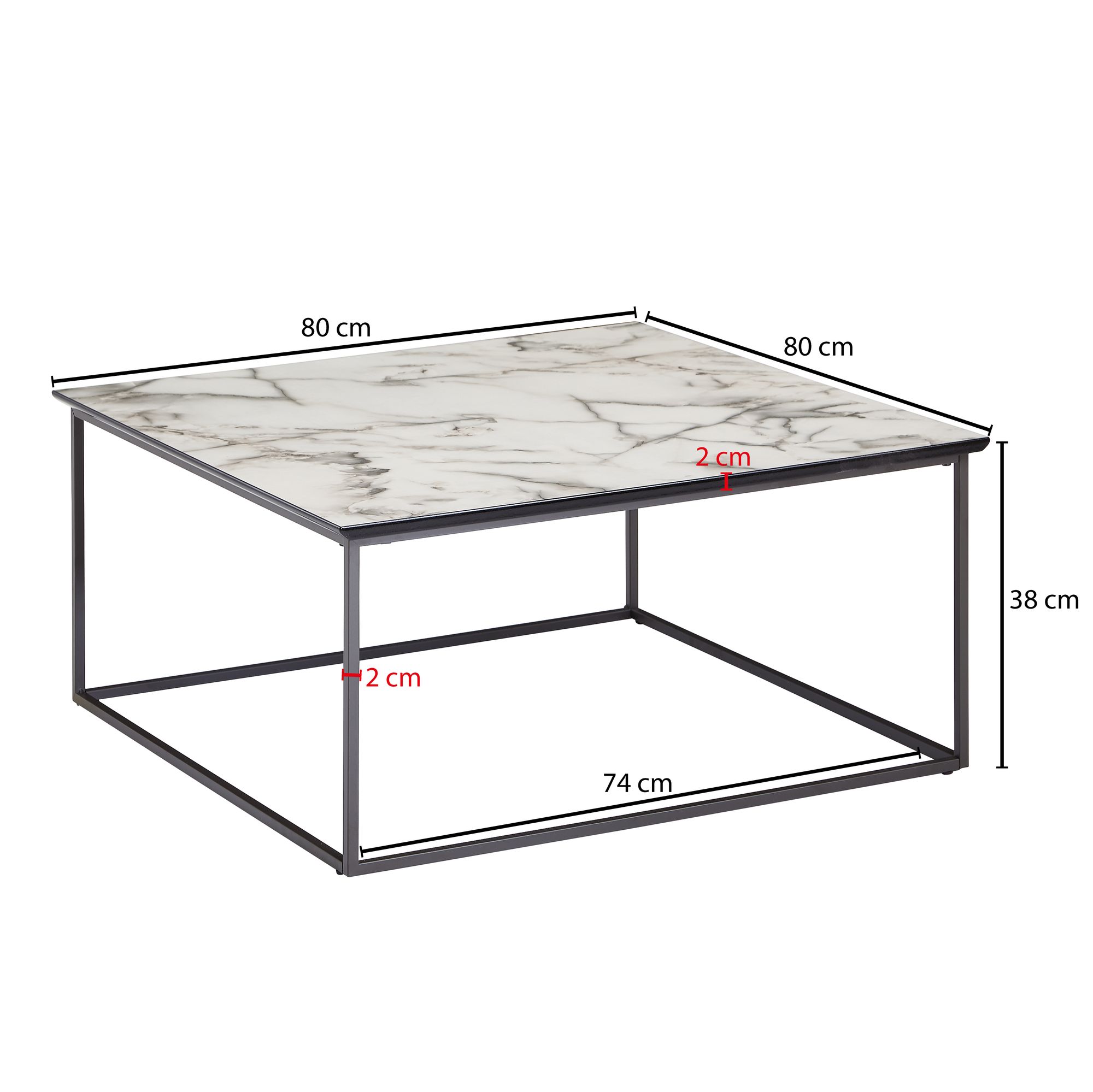 Informações de produto "Mesa de centro quadrada 80x38x80 cm | Tampo branco efeito mármore | Pernas metálicas pretas"