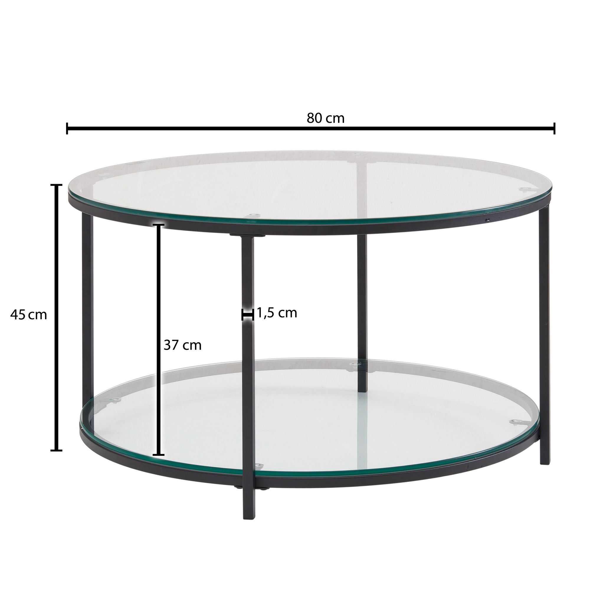 Descubra esta elegante e funcional mesa de centro redonda com estrutura de metal preto e duas superfícies de vidro transparente. O design moderno encaixa-se em qualquer sala de estar.