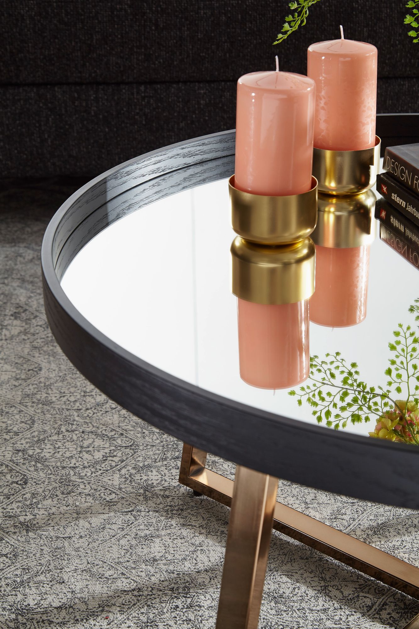 Mesa de centro redonda design | Estrutura metálica dourada escura com vidro espelhado preto | Ø 78 cm, Altura 42,5 cm