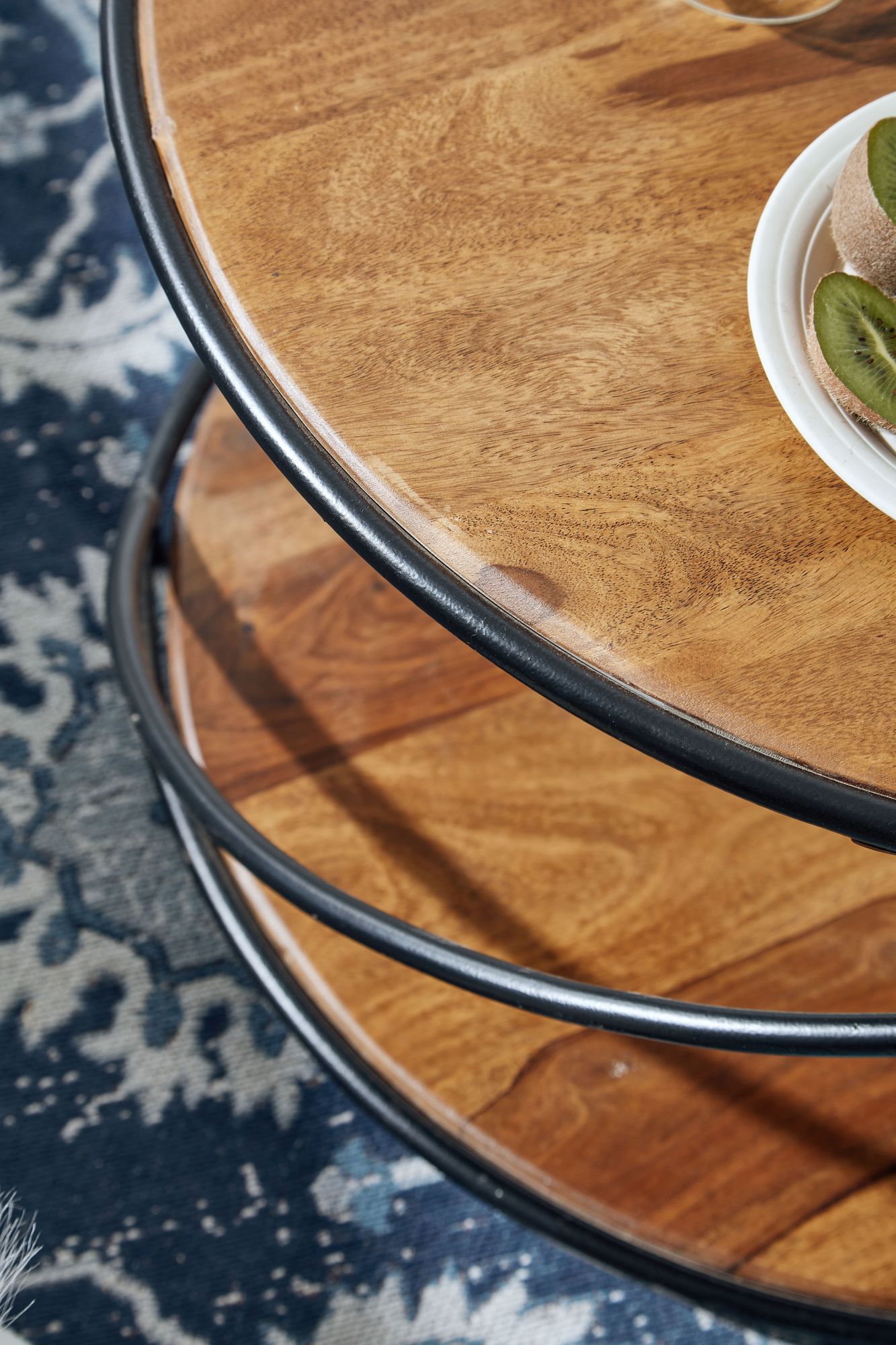 Esta mesa de centro redonda em madeira maciça de Sheesham e metal combina robustez e elegância para uma sala moderna. O design único apresenta uma estrutura distinta e duas prateleiras em madeira escura com acabamento em verniz transparente, oferecendo funcionalidade e estilo.