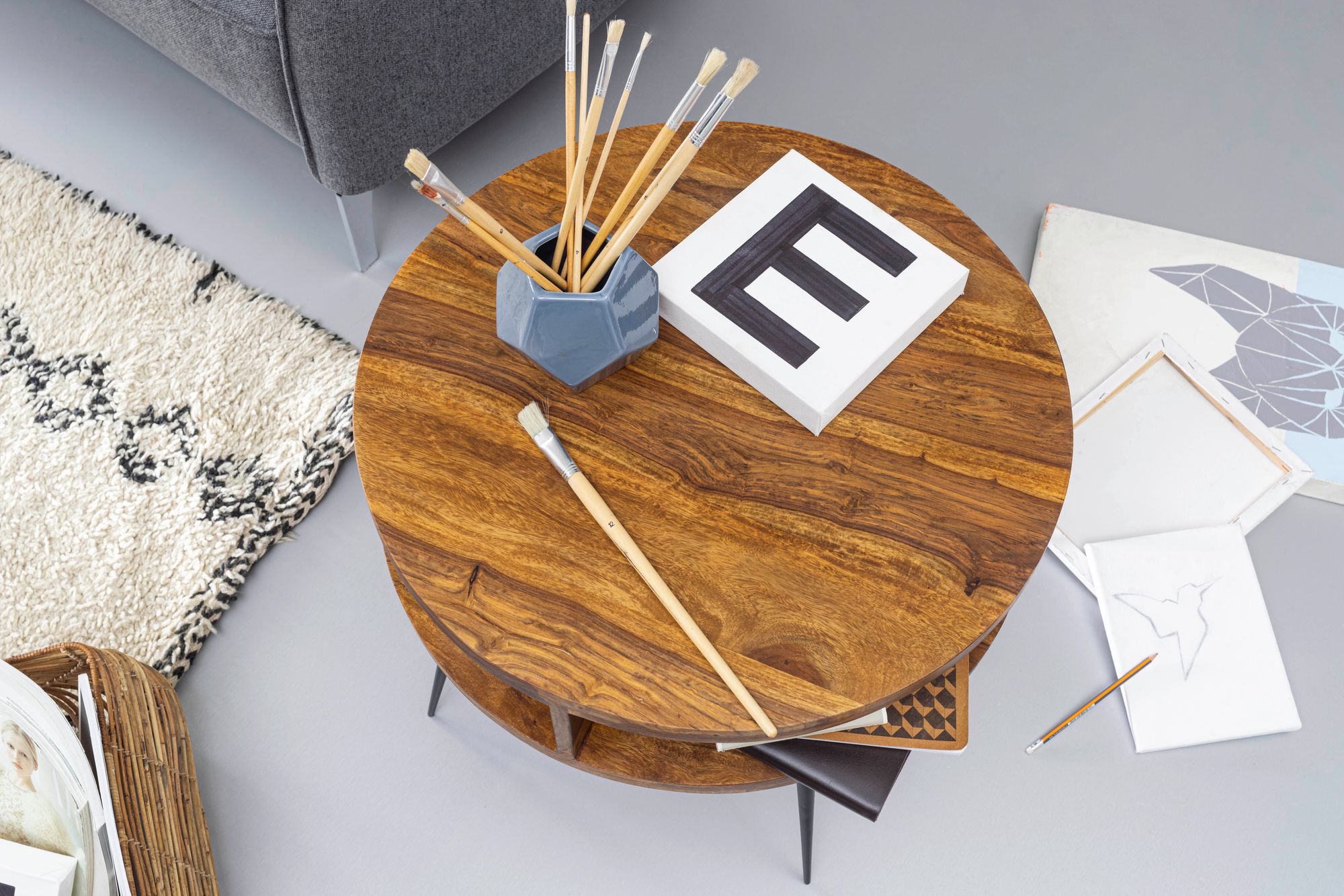 Esta mesa de centro combina o calor da madeira maciça de Sheesham com a resistência do metal para um design contemporâneo e prático. O tampo redondo de 60 cm de diâmetro é complementado por quatro prateleiras laterais para armazenamento discreto.