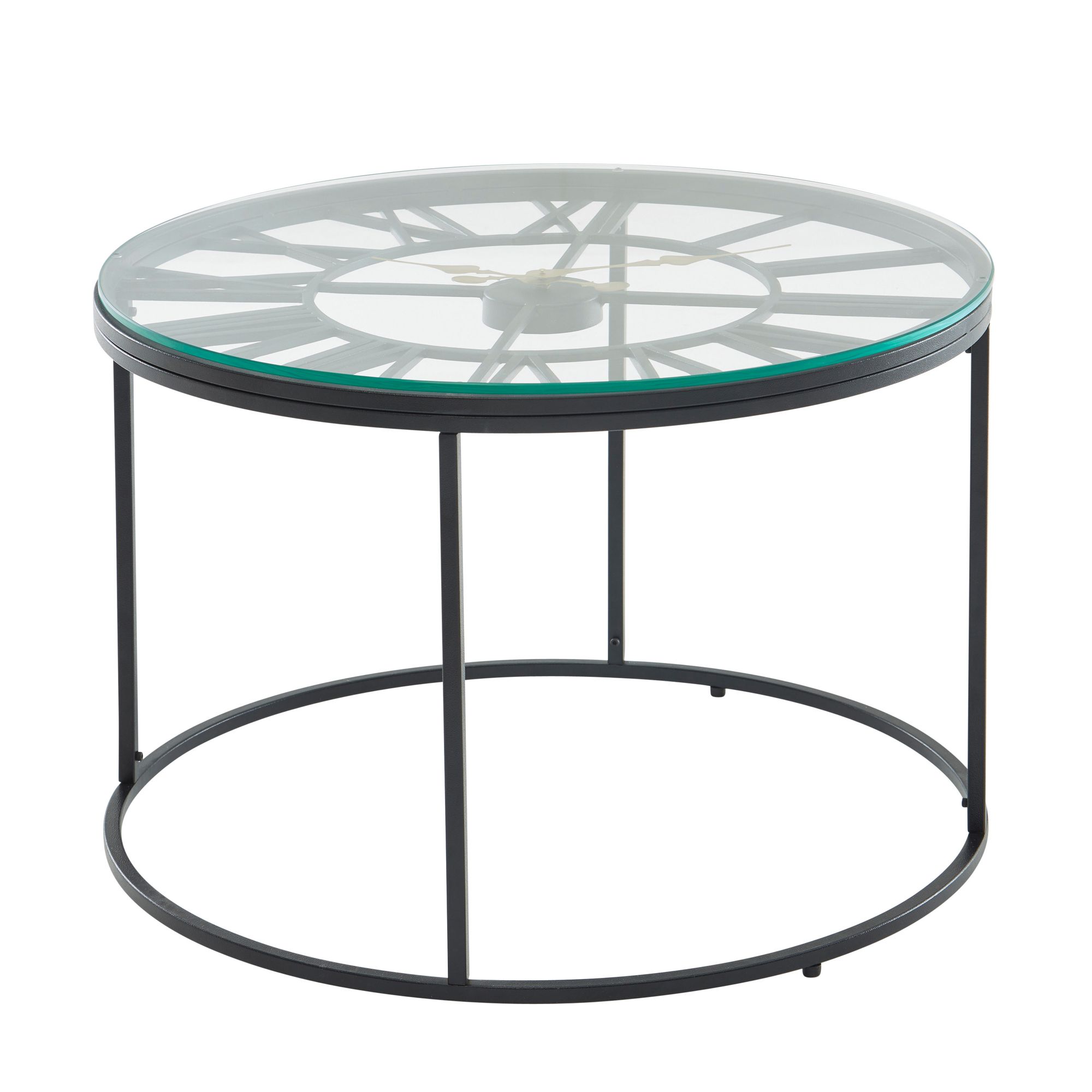 Mesa de Centro Vidro Metal Preto 60x60x43 cm | Mesa Redonda Moderna com Relógio Decorativo
