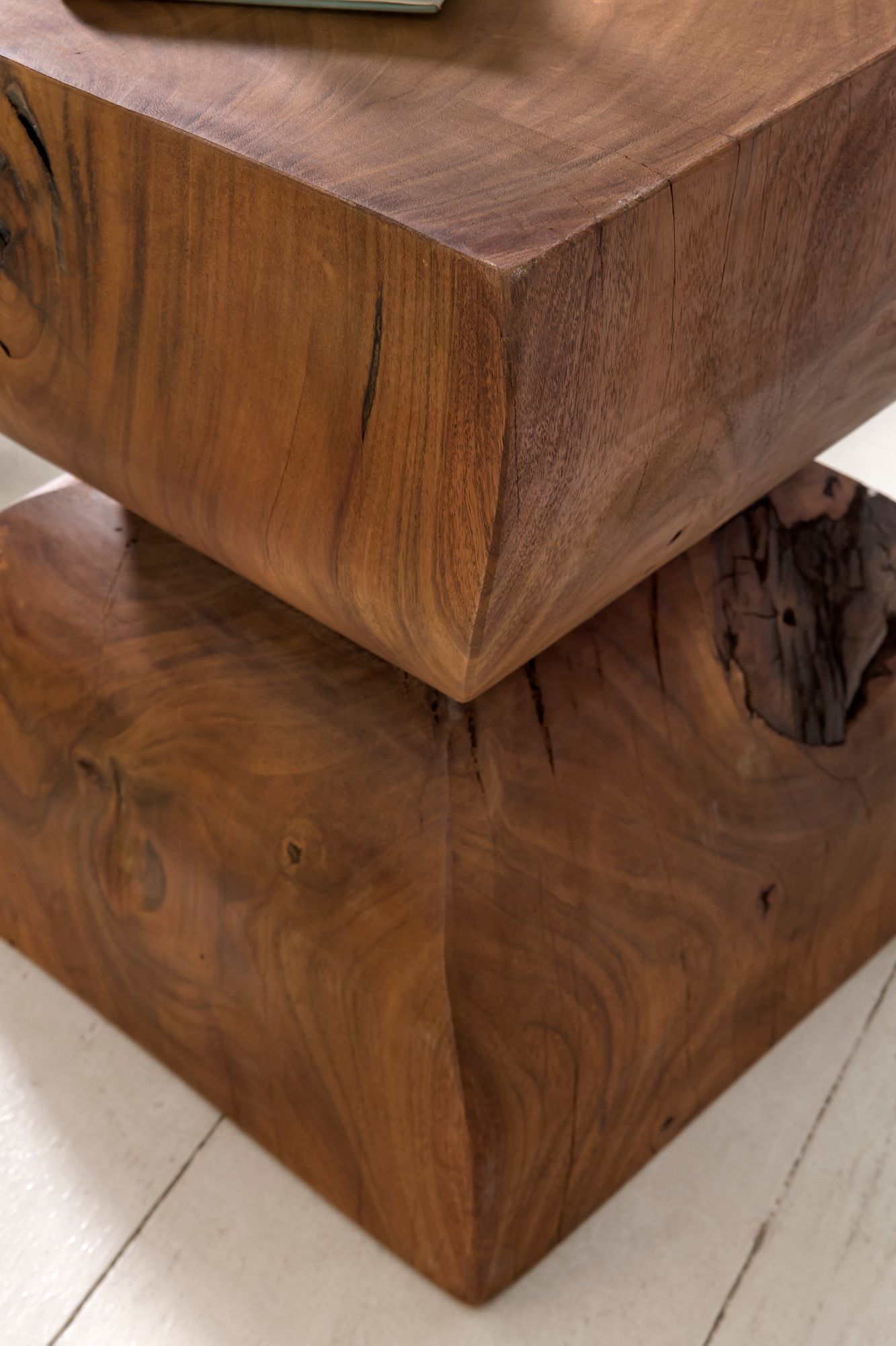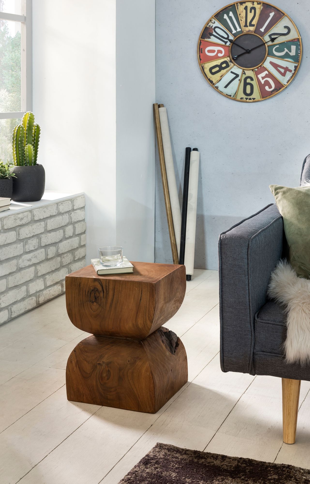 Traga calor e autenticidade para sua casa com esta mesa lateral em madeira maciça Sheesham marrom, com design rústico e cantos arredondados, formato ampulheta. Cada peça é única pelas veias e nós naturais da madeira.