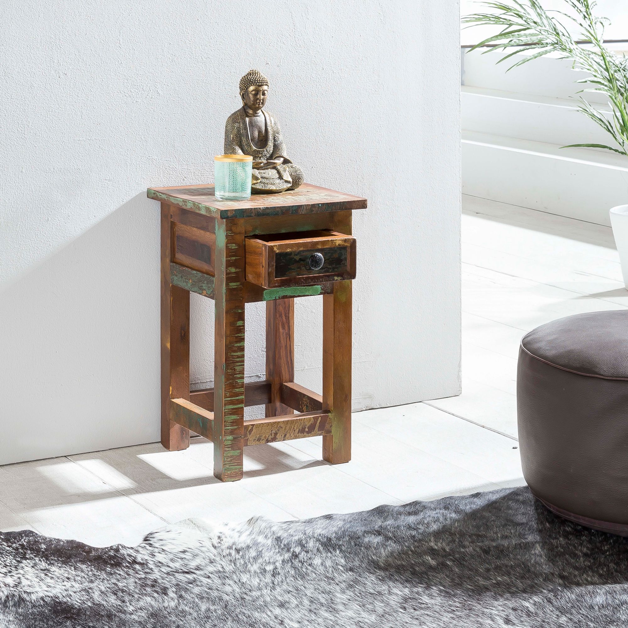 Adicione elegância vintage à sua casa com esta mesa lateral Kolkata em madeira maciça reciclada, design Shabby-Chic. Cada peça é única graças ao acabamento artesanal e veios naturais.