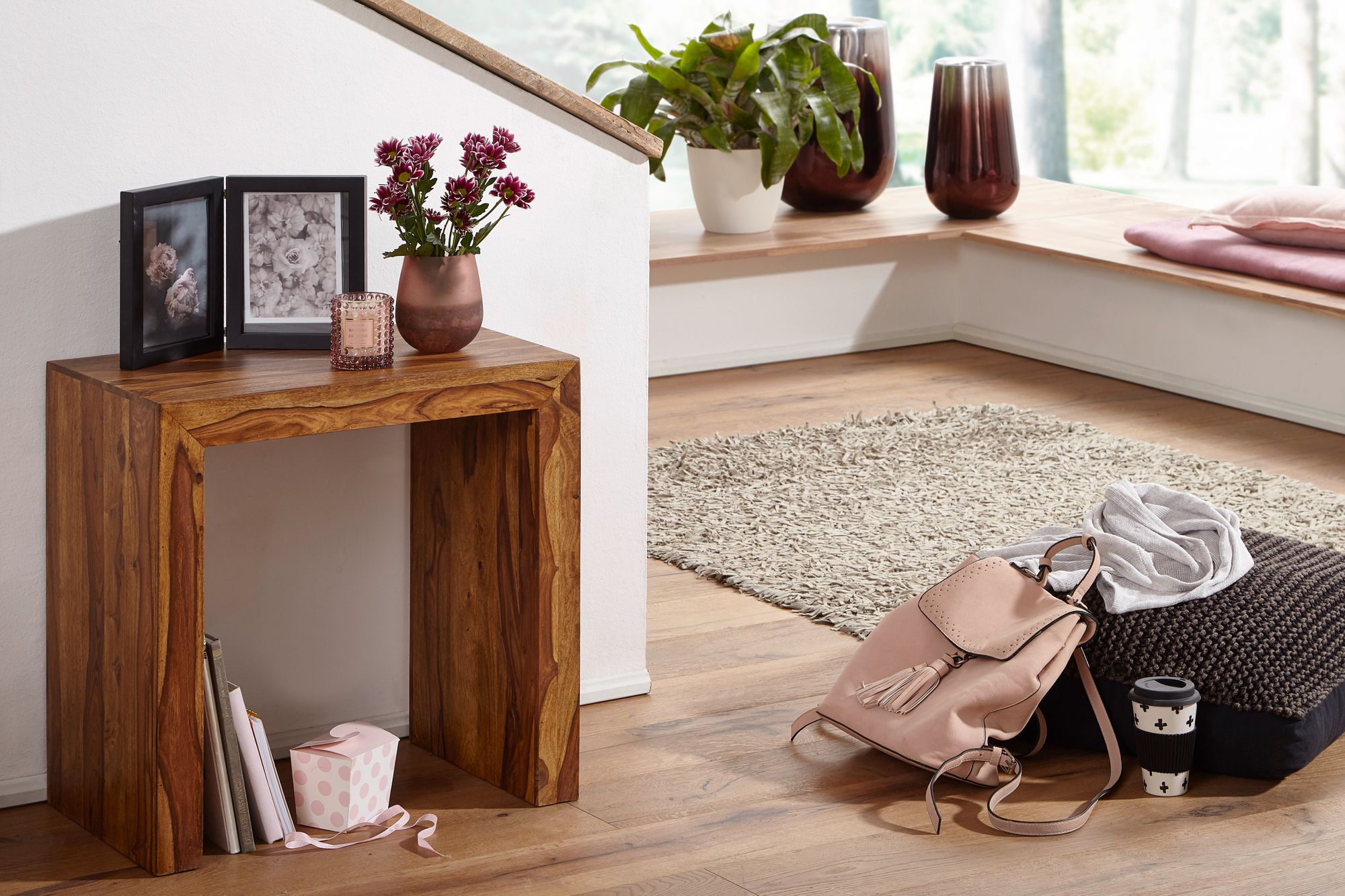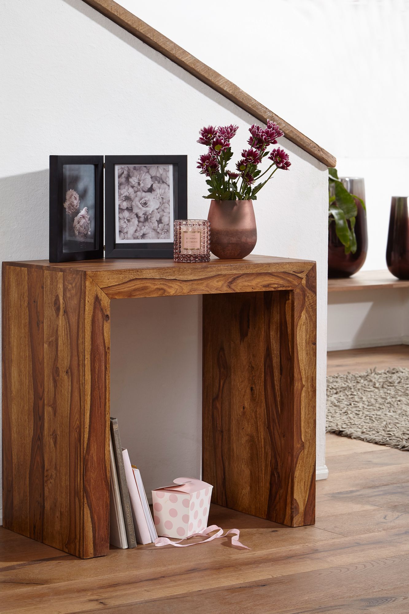 A mesa lateral MUMBAI em madeira maciça Sheesham, na cor castanho escuro, combina design clássico e funcionalidade. Suas dimensões compactas são ideais para cantos ou como superfície de apoio na sala.