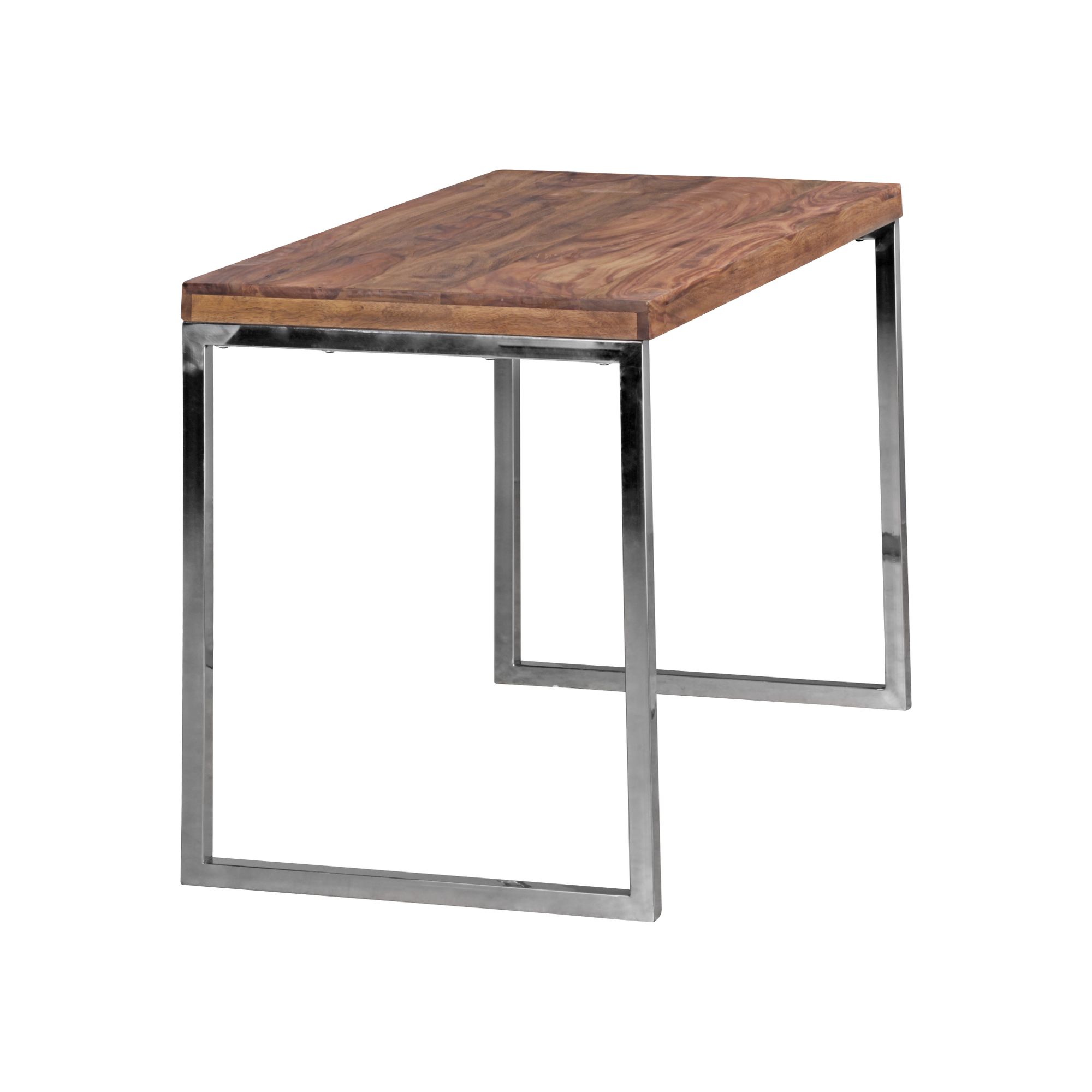 A secretária GUNA em madeira maciça Sheesham combina elegância e robustez para o seu espaço de trabalho. A superfície em madeira natural com acabamento em verniz claro e as pernas metálicas cromadas criam um contraste quente e moderno. Projetada em estilo rústico, oferece uma área confortável e otimizada.