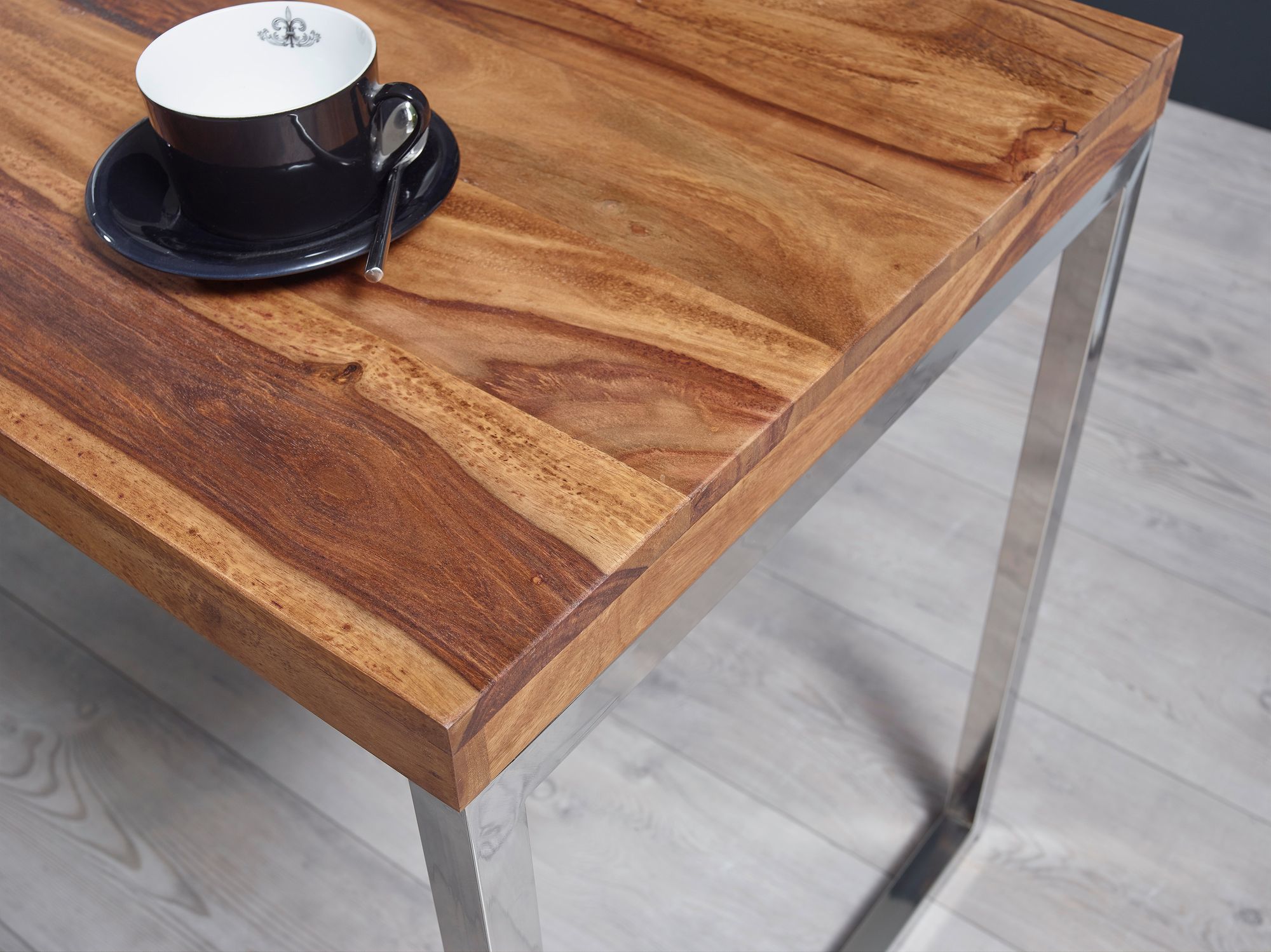 - Material do tampo: madeira maciça Sheesham com acabamento em verniz claro