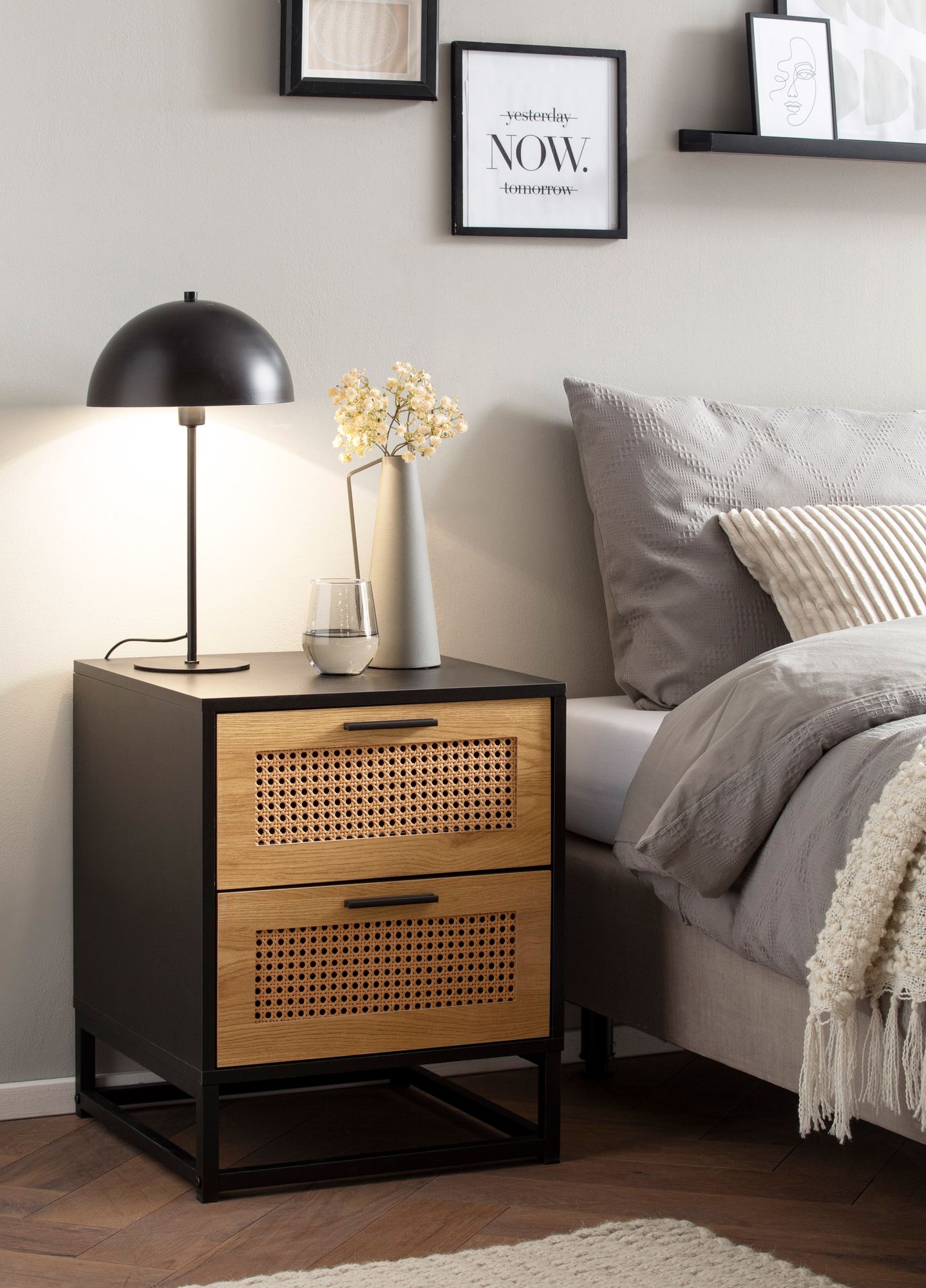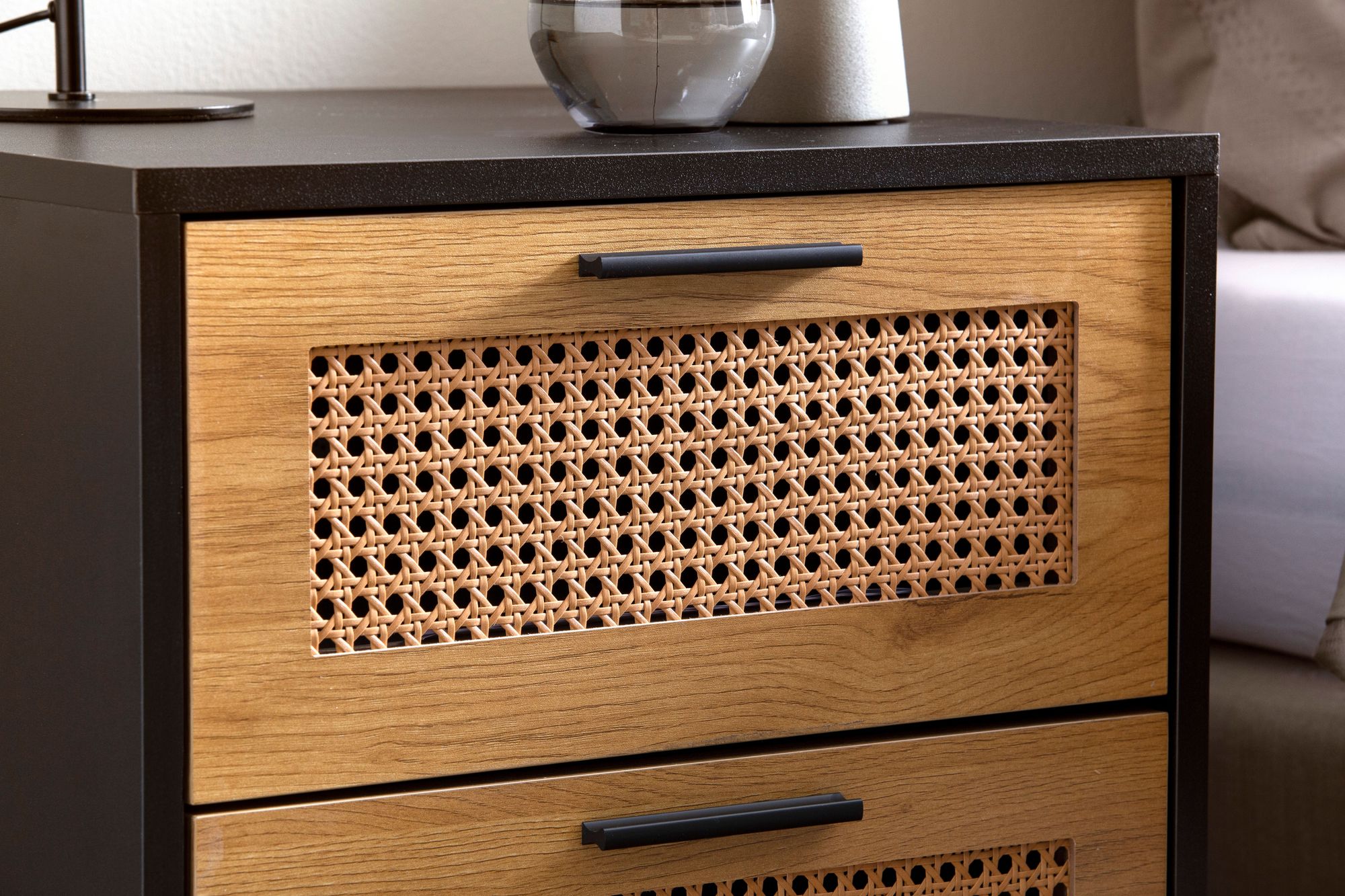 Esta mesa de cabeceira preta apresenta um design simples com frentes de gaveta em trançado vienense (poliratã). Construída em MDF laminado com revestimento de resina melamínica e pés de ferro pintado a pó para durabilidade e estilo.
