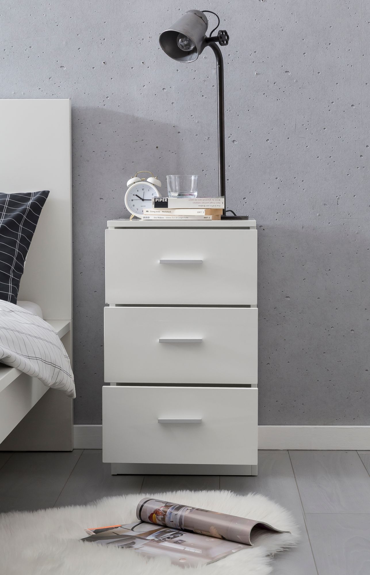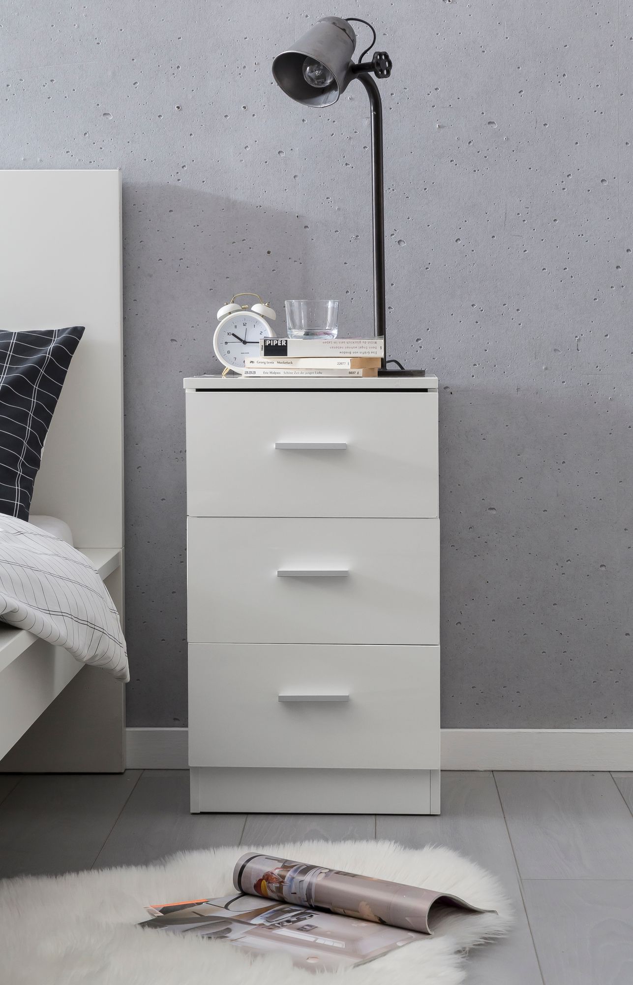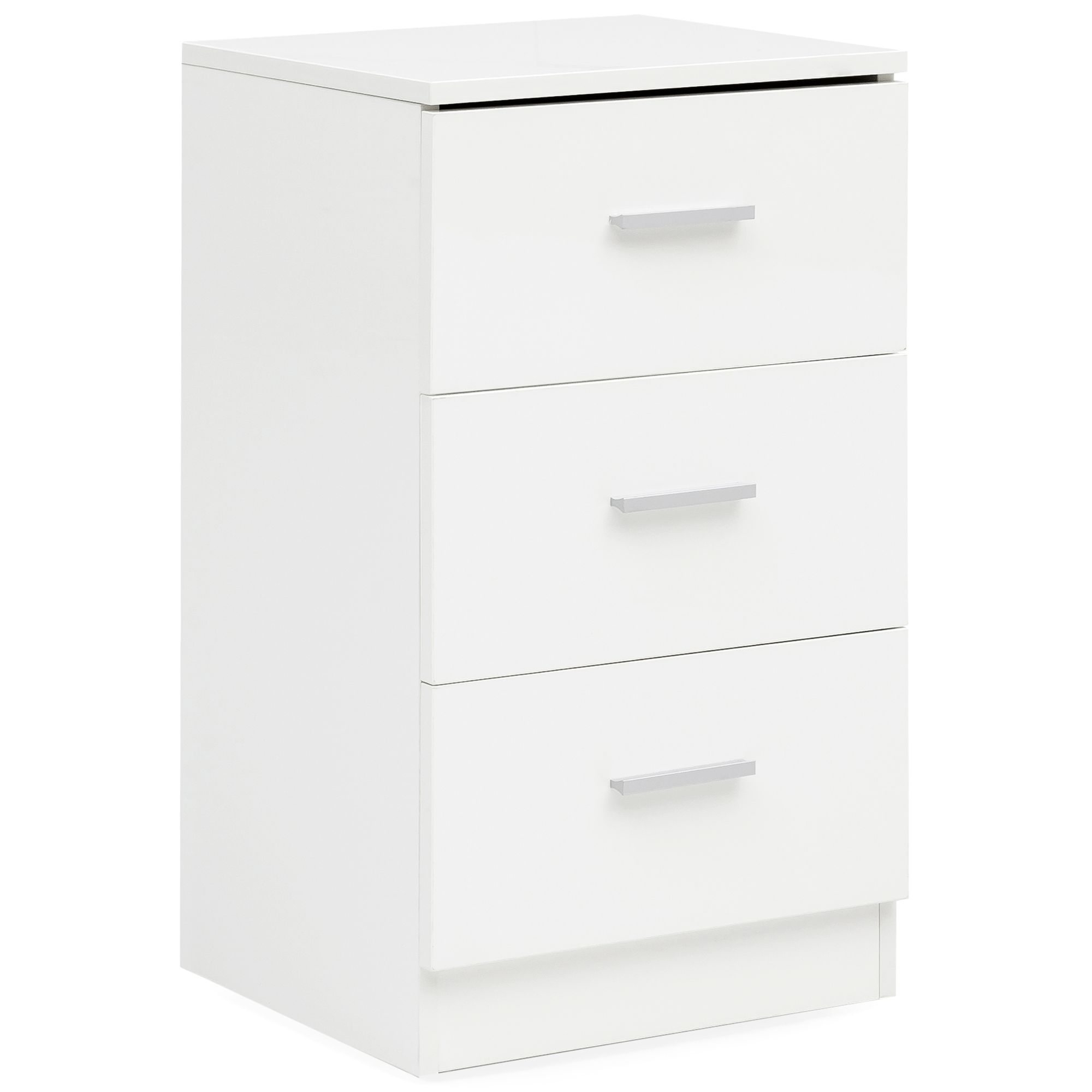 - Mesa de cabeceira elegante com três gavetas num visual de alto brilho