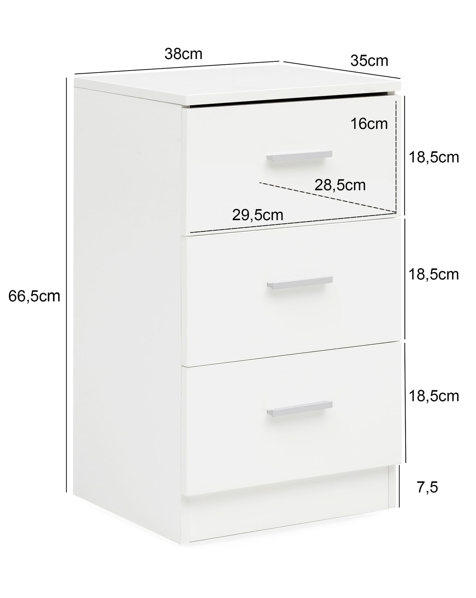 - Dimensões internas por gaveta (L x A x P): 29,5 x 16 x 28,5 cm