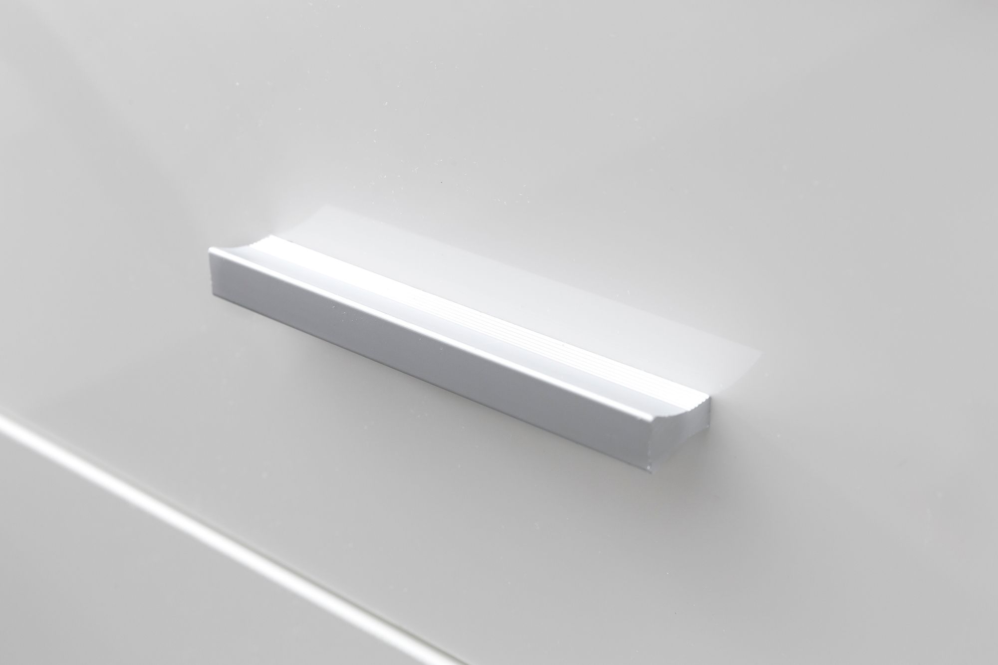 - Três alças de prata adornam as gavetas